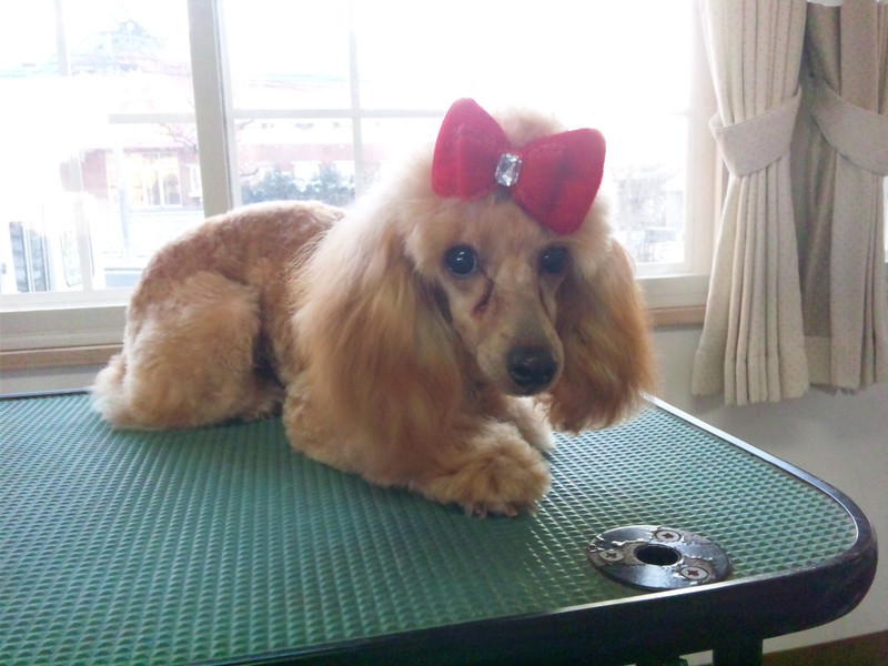 プードルのベイクちゃんは本日頭の毛を伸ばしていくと言うことで結んでリボン装着