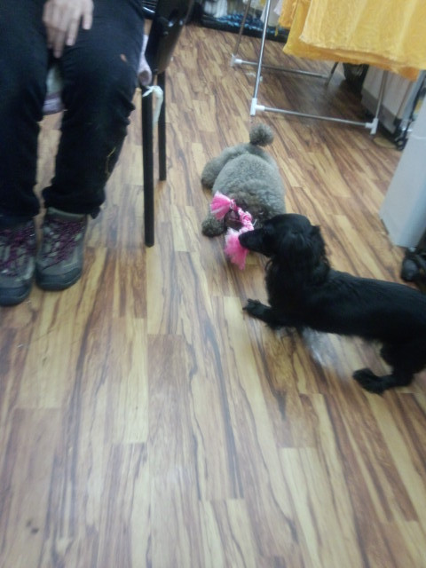 只今綱引きを店のわんこと奮闘中のクゥちゃん
