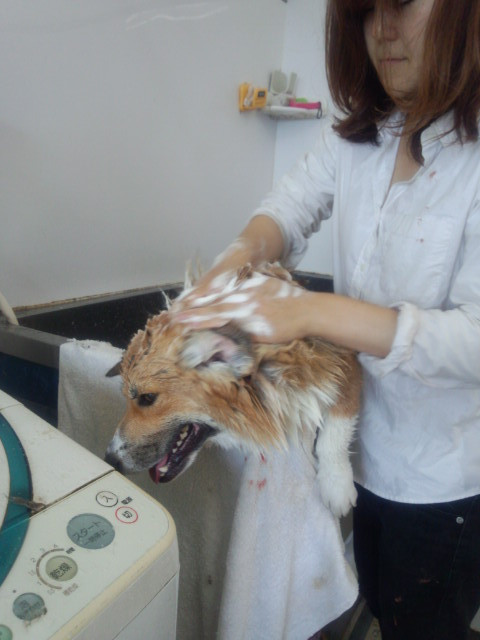 米沢よりお越しのサスケくんは今日も元気にシャンプー中