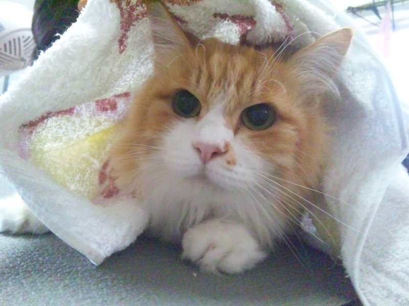 周りに大きなワンコ達がいるのでタオルに隠れながらの作業