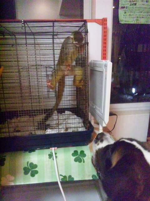 青春通店の顔になりつつあるリスザルのジョージと我らがわんニャンシャンプーのボス…大看板犬!の、セントバーナードのクララさんの初対面シーン