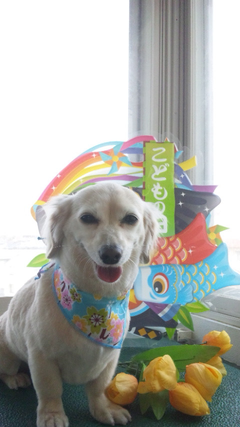 水色のバンダナを付けて、スタッフと一緒にお家にご帰宅です