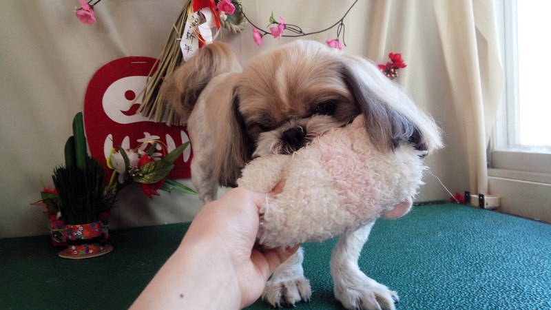おもちゃ大好きなクーちゃんは写真撮影のときにおもちゃを見るとハミハミ
