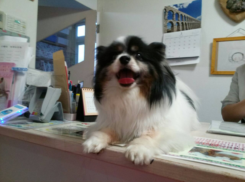 今日も夕方の自由時間中スタッフの気を引こうとデスクワーク中のスタッフの前でお座り