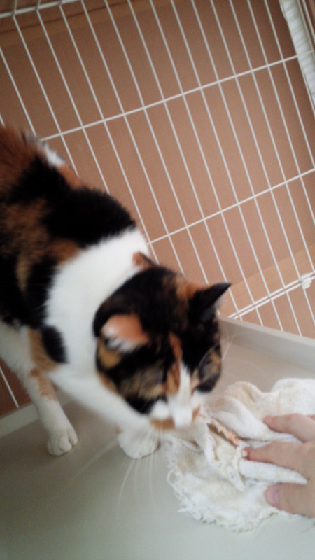 スタッフがミィちゃんのケージをふきふきしているとおもちゃだと思い、スタッフの手を攻撃してくるミィちゃん(*゚Д゚)!
