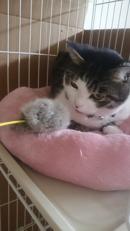 スタッフがおもちゃで遊びに誘ってみましたが、効果はないようです…残念。