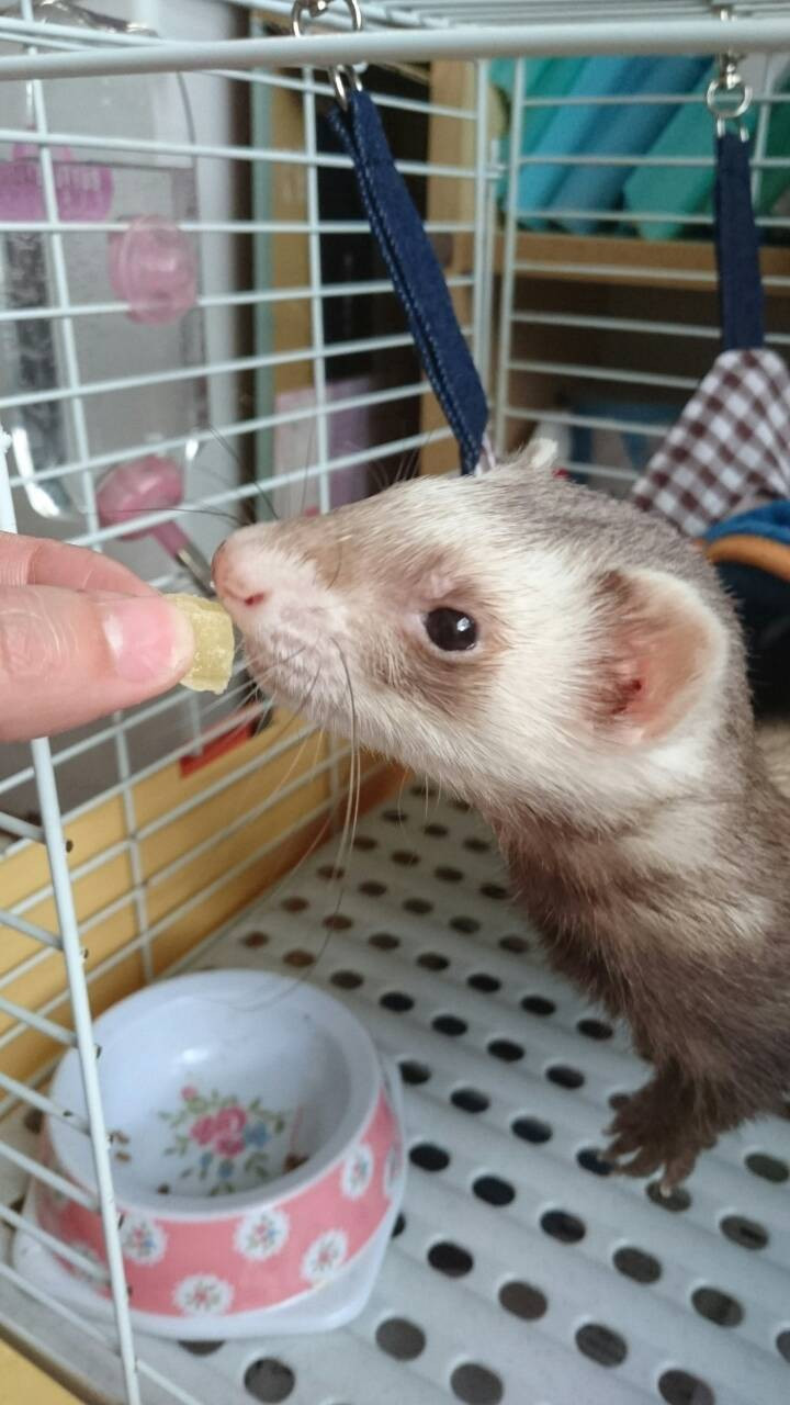 スタッフからおやつをもらい、一端器に入れて器の中で味わって食べるメイちゃん