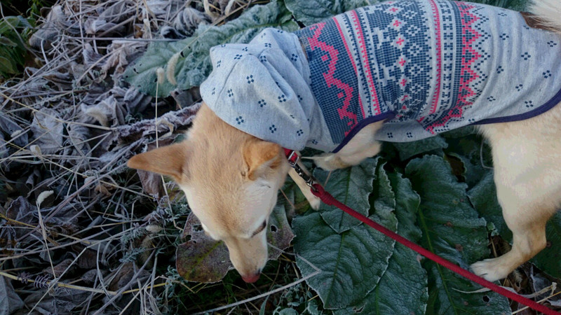 今朝は霜が降りた葉っぱの上を歩いて散策