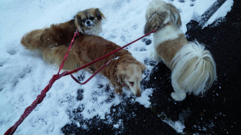 雪でテンション上がりぎみなひかりちゃんと我が道独走中のななちゃん、ちょっぴり怖くて後ずさりぎみなみらいちゃん
