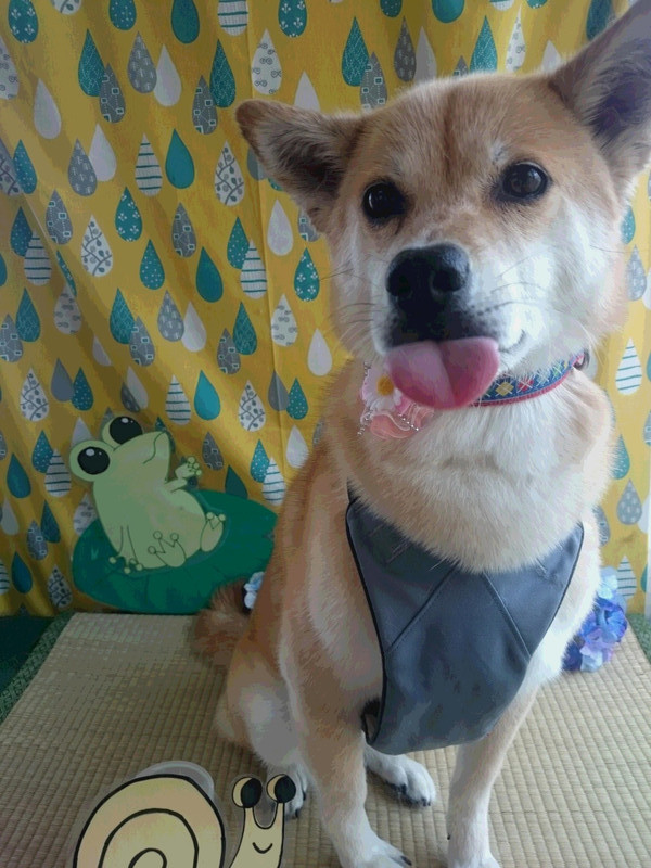 ニコニコ笑顔でお座りしながら背中を貸してくれる心広いチョコちゃん