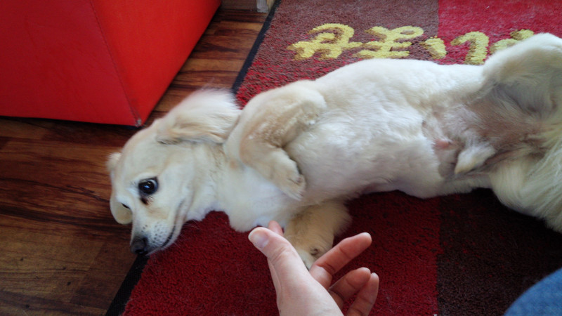 スタッフと遊んでいるとお腹を出してくれたアクアちゃん(((o(*゚▽゚*)o)))