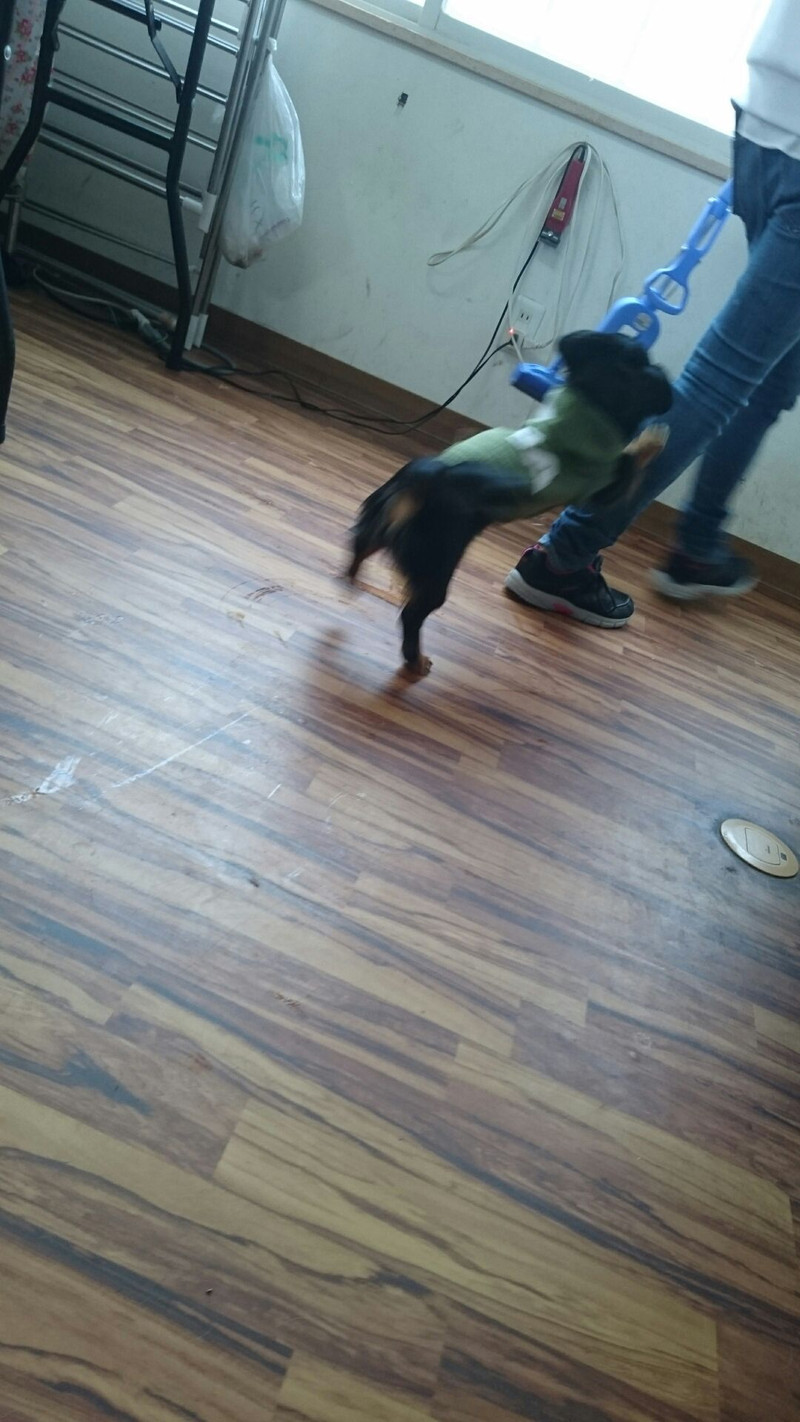 室内でスタッフの後をピョコピョコ追いかけて遊んでます