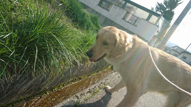 元気いっぱいお散歩に行って側溝を飛び越えて田んぼ道とを行ったり来たり