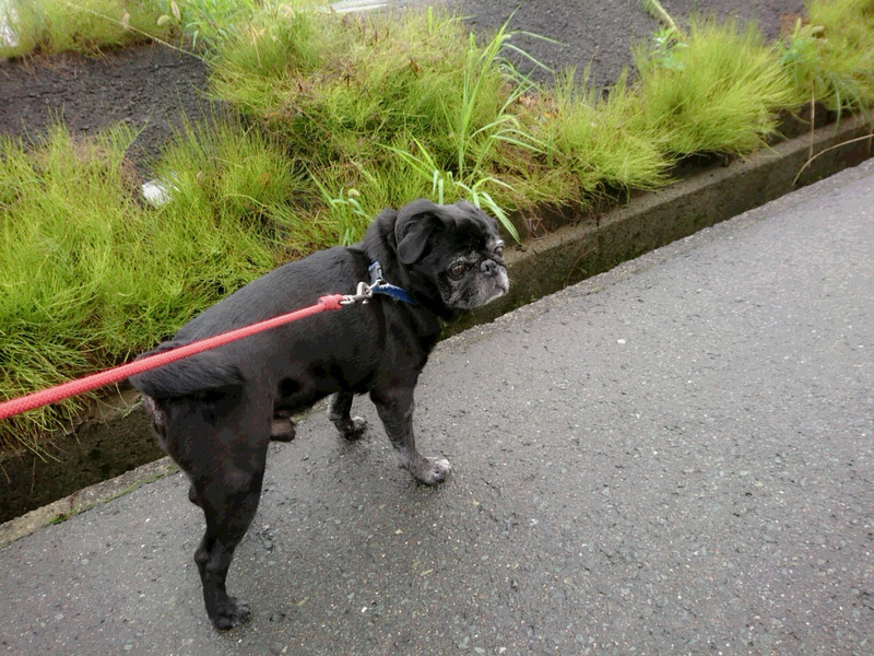 尻尾を振りながらお散歩中のバーディーちゃん