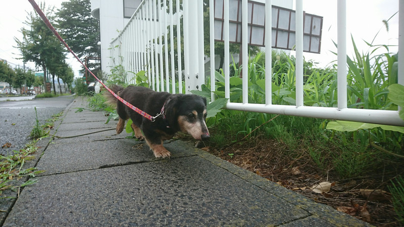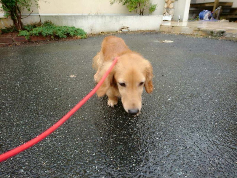 今朝は雨が降ったようで道路が濡れていますが、お散歩に行く時間帯は雨も上がりずぶ濡れは免れました