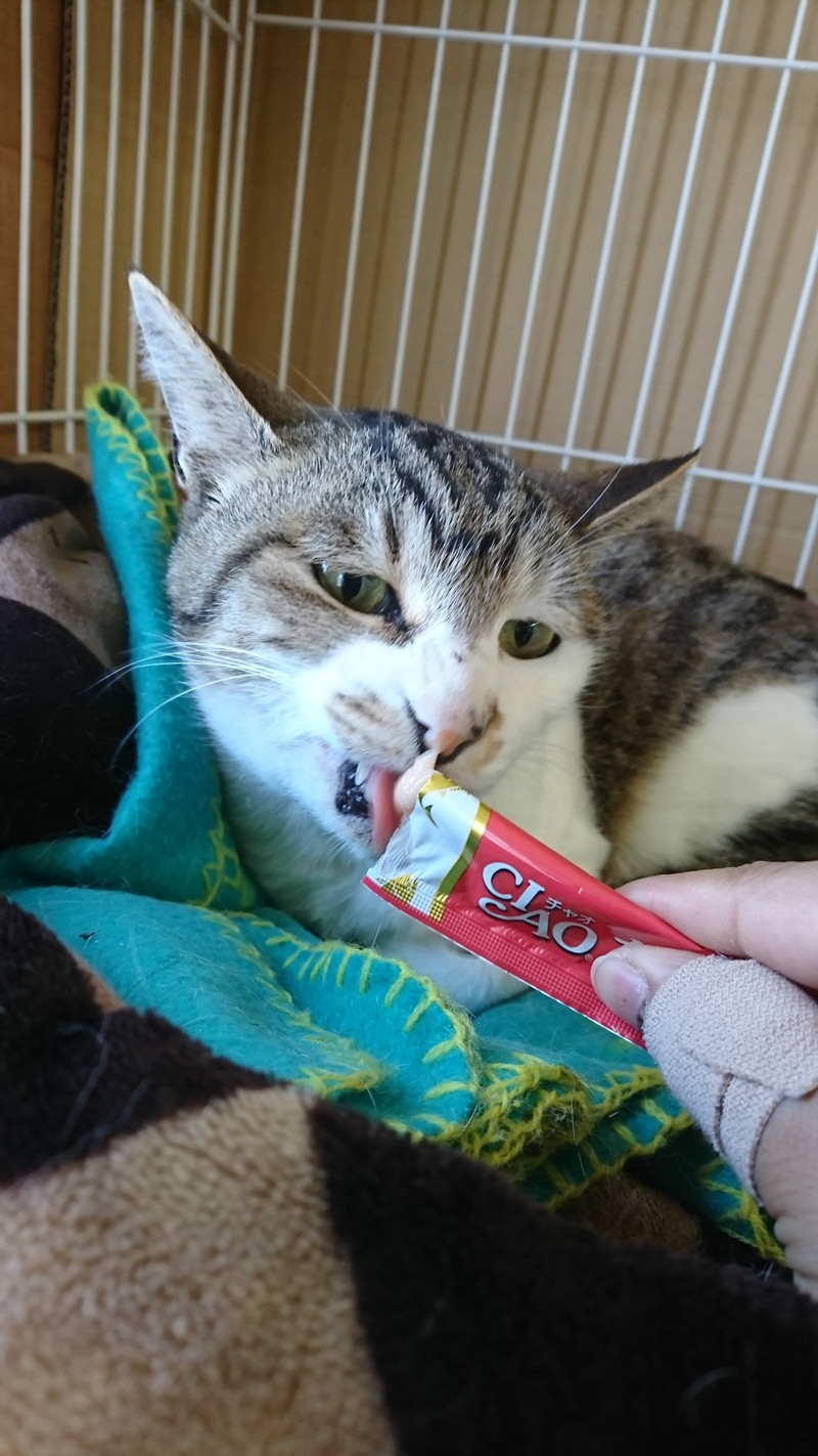 今日はスタッフからちゅーるを貰ってぺろぺろ食べてくれたとんかつちゃん