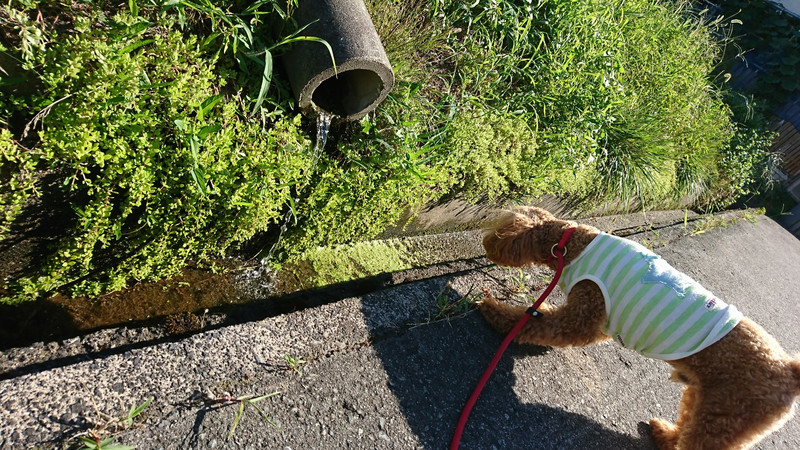 たまに一気にドバっと水が飛び出ることがあり、ビックリしながらも気になるみたいで側溝の中を覗いたり排水溝を見つめたりと興味津々でした