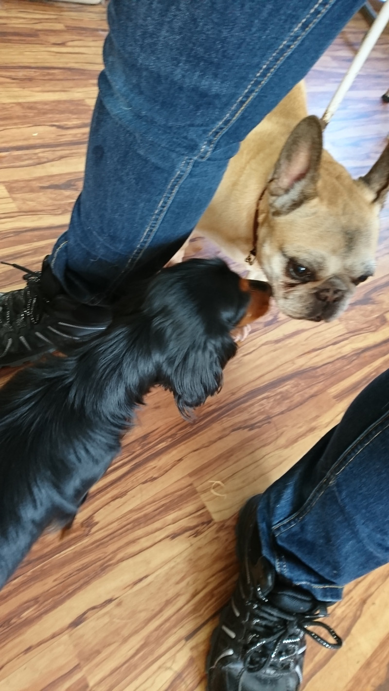 今回はフレブルちゃんも参戦して、少し恐る恐るスタッフの股下からそーっとご挨拶