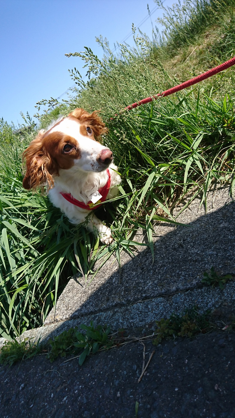 草むら探索中、なかなか際どいところを歩く、ひまわりちゃんは草で隠れた側溝のふち、ギリギリを歩いて行くのでスタッフはハラハラしながら見守っております