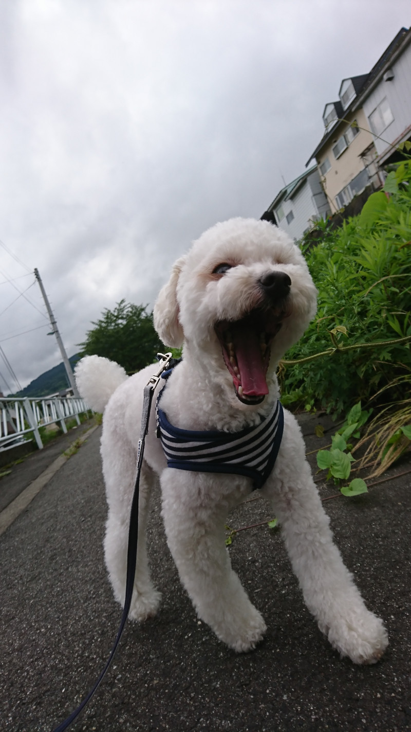 寝起きの朝一番のお散歩はちょっぴり眠く大きなあくびが出ちゃいました