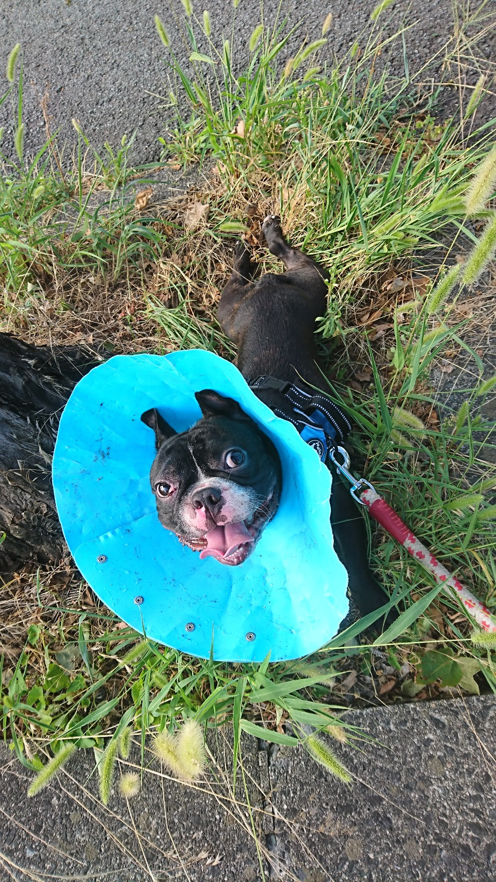 道路の横断待ち中に街路樹の根元の茂みにてべローンと休憩中でした