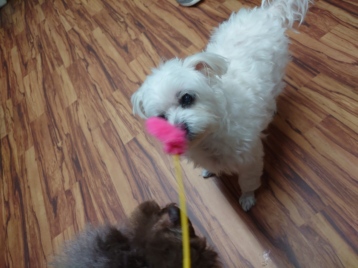 ねこじゃないけど、少しねこじゃらしに興味を示してくれたモモちゃんでしたが、プードルの子が乱入してきてかじって持っていてしまったのであっという間におもちゃタイムが終了してしまいました(´·ω·`)ポカーン