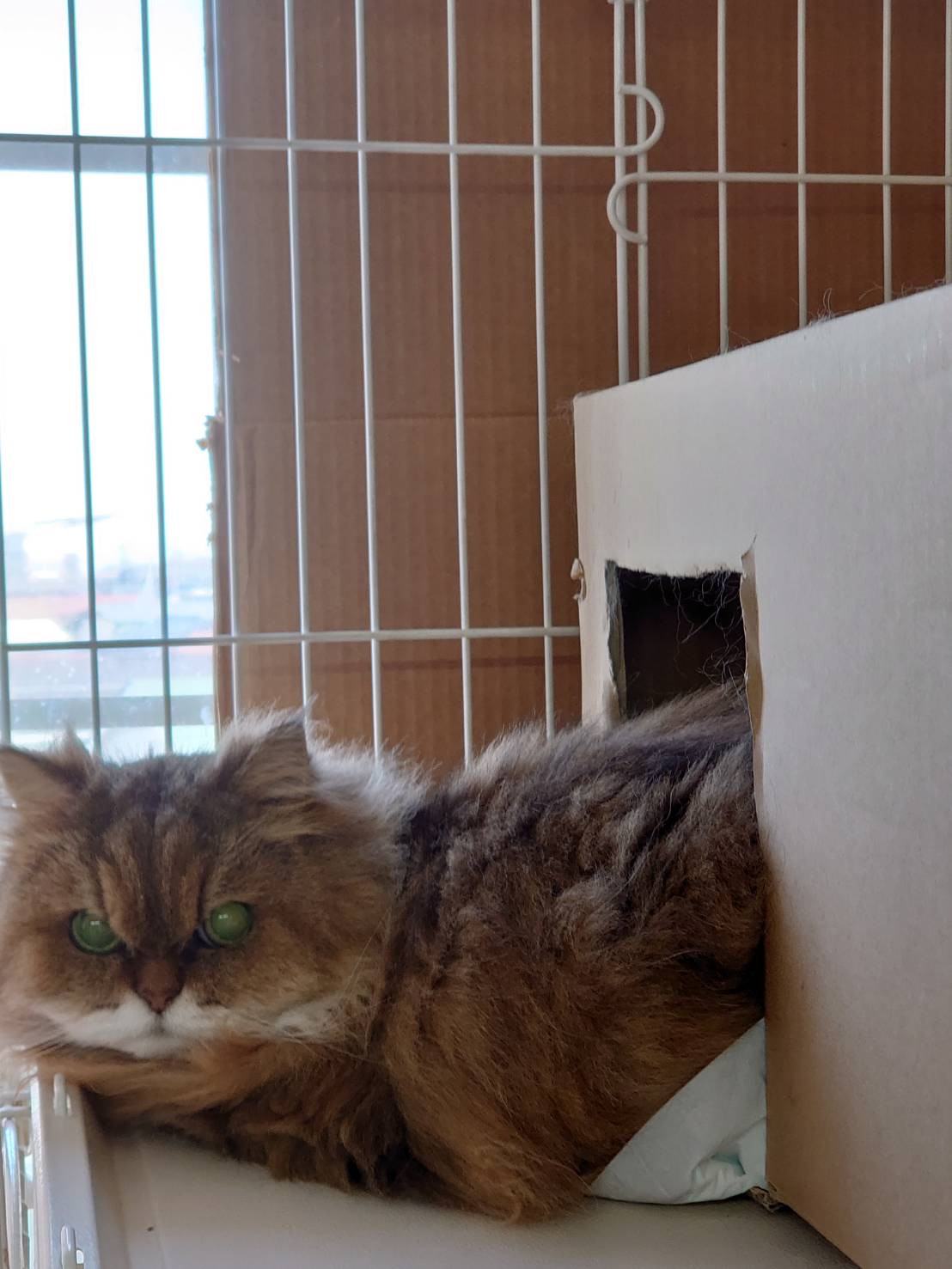 今日は箱から半分だけ体が出ている状態でお外をジィーっと眺めておりました