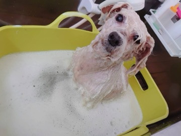 いつもは立ちながらシャンプーしていた作業も今回も気持ちよくてお座りしながら、ちょこんと入浴してたよ