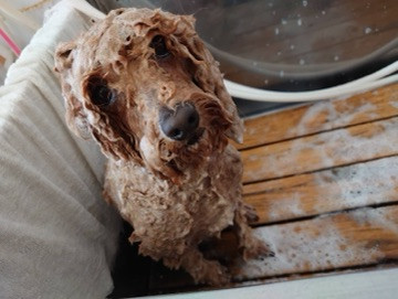 シャンプーで泡泡ペッタンコに濡れたキャンディーちゃん