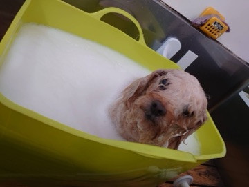 ポップちゃんお座りして上手に浸かってたね
