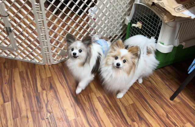本日からお泊まりご利用のレイちゃんとマツカゼちゃんです! 今日も、ママたちとふたり仲良く遊びに来てくれました!🌧 室内では、色んなわんちゃんにびっくりしながらごはんも少しだけ食べてふたり仲良くお泊まり頑張ってます!😊✨