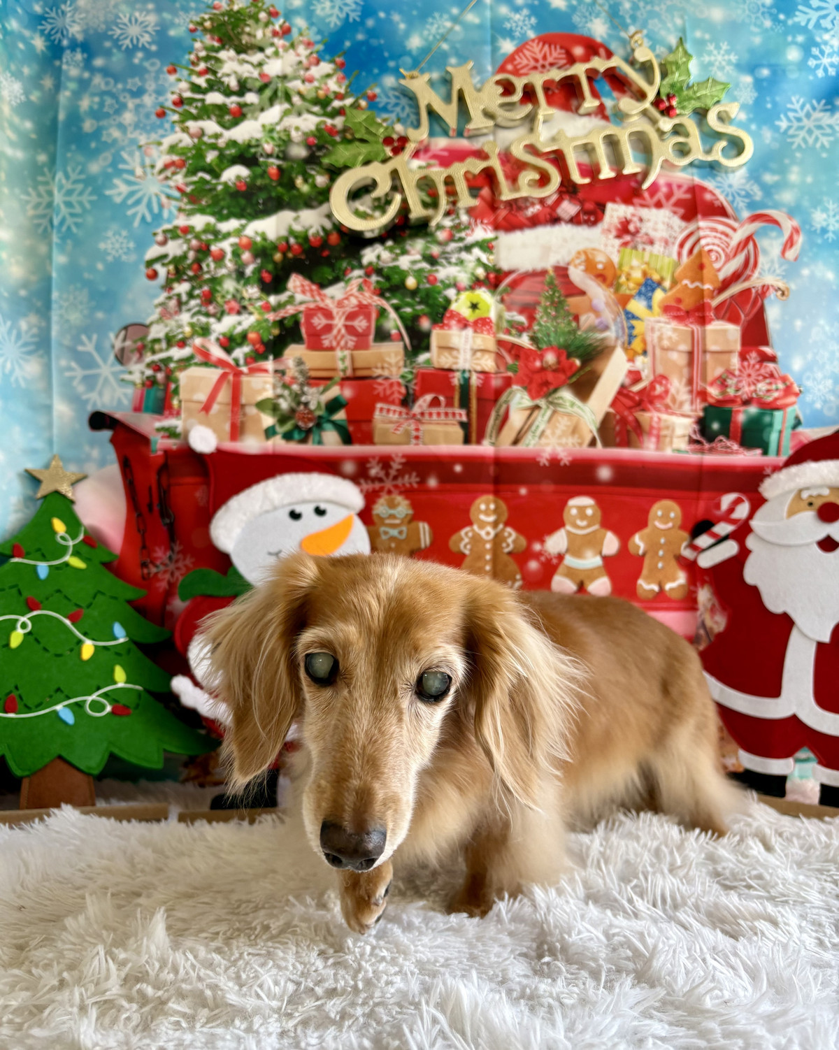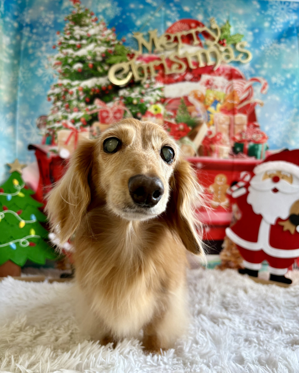 今日からの クリスマス背景 で、サンタの置物や雪だるまに囲まれながら、とびきりキュートにパシャリ🎄❄️はなちゃんの優しい表情が背景と相まって、とっても素敵な一枚になりました✨