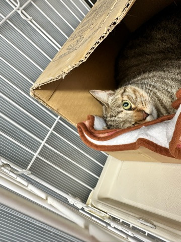 箱の中ですっぽり寛ぎ中でしたが、カメラを構えるスタッフにお目目をまん丸にさせて視線だけでスタッフの動向をチェック中です
