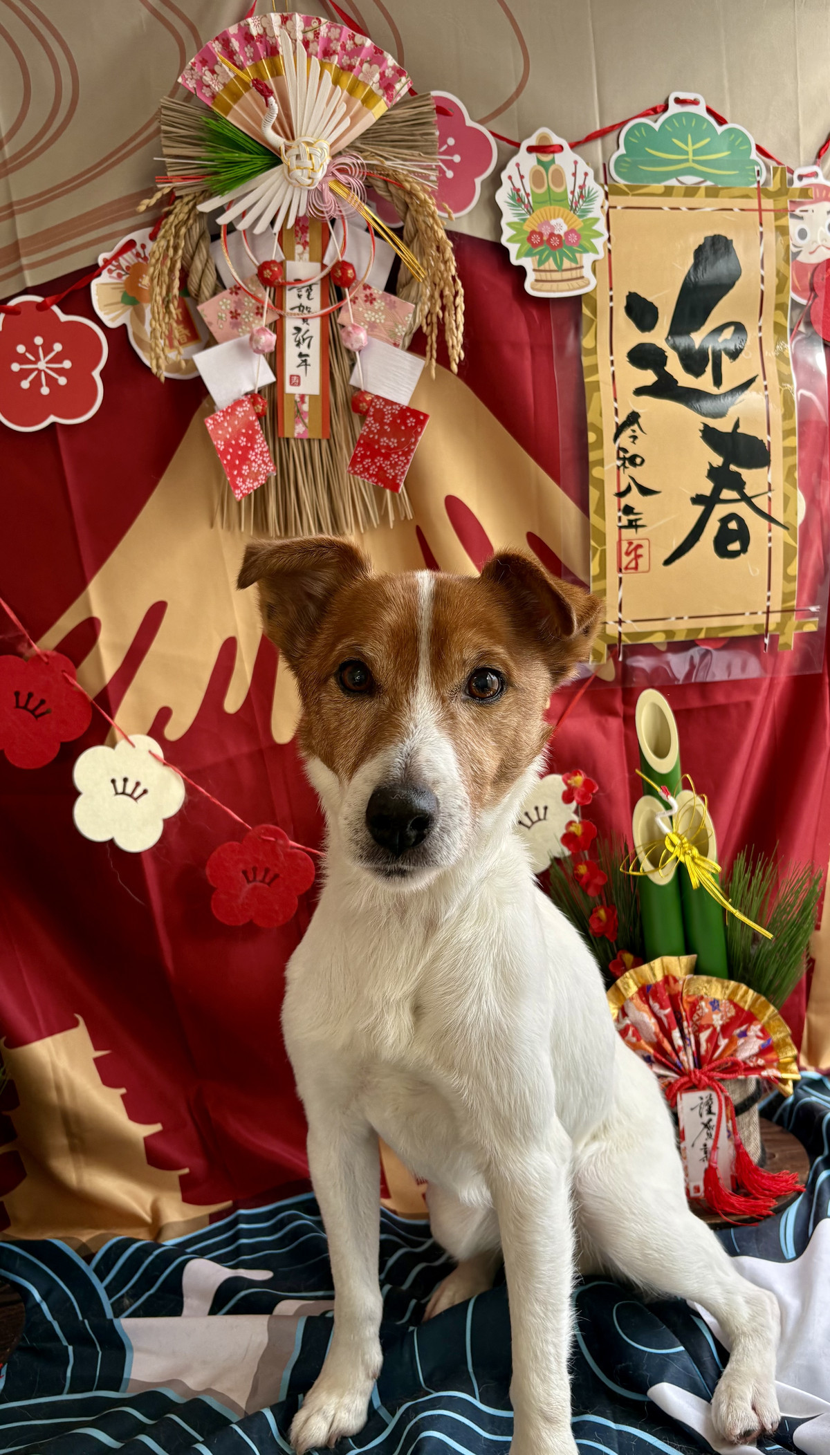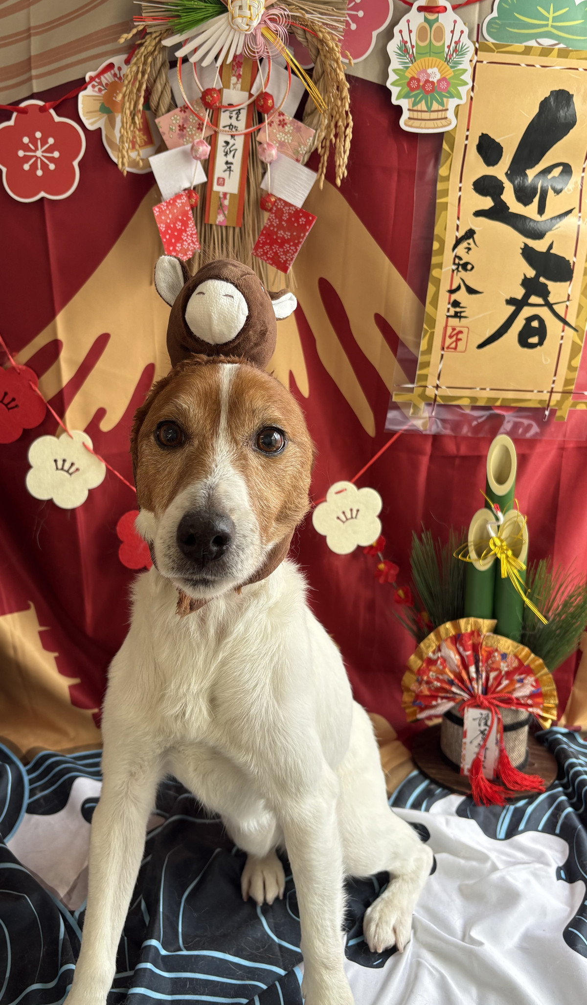 お写真はお正月背景でパシャリ📸門松や赤富士、梅の飾りに囲まれて、マロンちゃんのいきいきとした表情がとても映える一枚になりました🎍✨