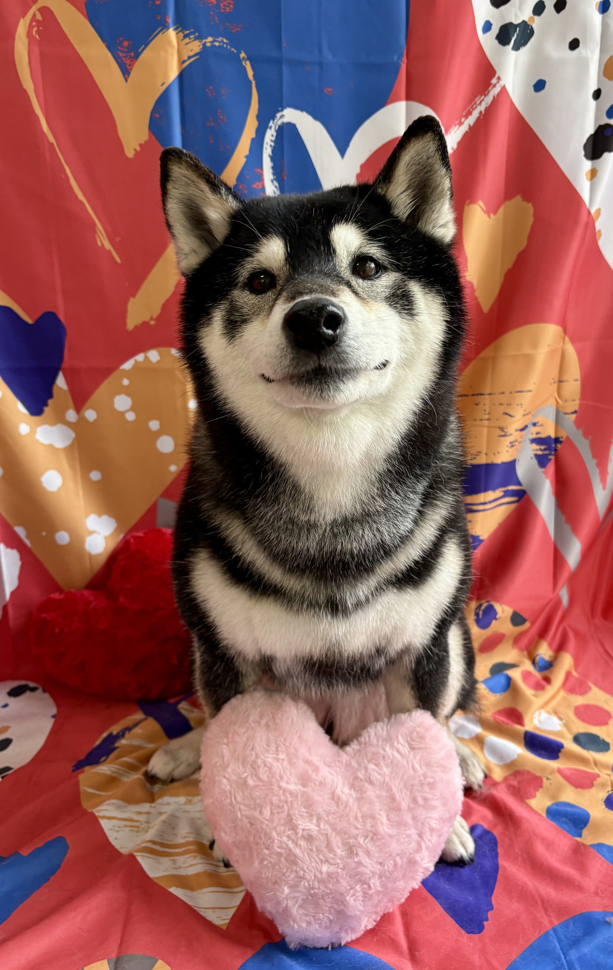 お写真はバレンタイン背景でパシャリ📸🍫ハートいっぱいの背景に囲まれて、マロちゃんのとびきりの笑顔がとても素敵な一枚になりました💖